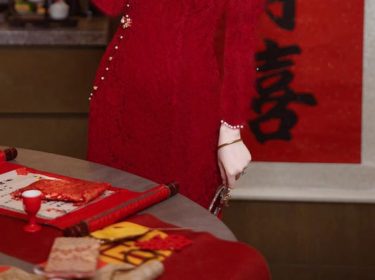 Mandarin Collar Bow Jacquard Frog Closure Chinese Wedding Vest / Spaghetti Strap V-Neck Plain Satin Maxi Trumpet Dress / Set