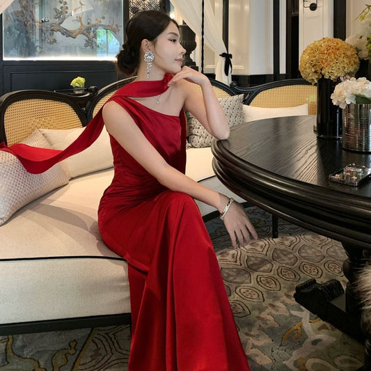 One-Shoulder Plain Ruched Trumpet Evening Dress