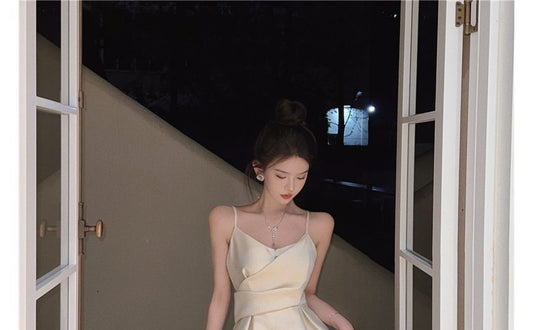 Spaghetti Strap V-Neck Plain Satin Midi A-Line Dress
