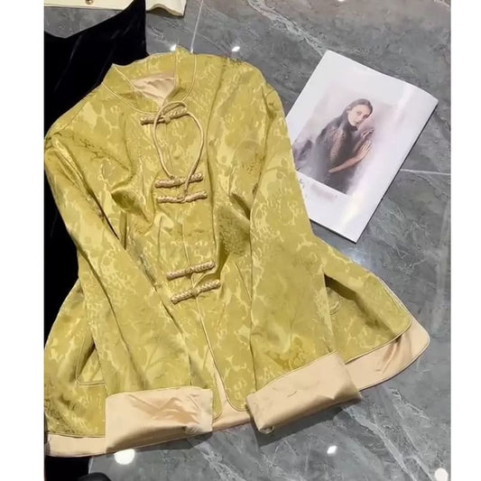 Long-Sleeve Band Collar Floral Hanfu Blouse / Spaghetti Strap V-Neck Plain Midi A-Line Dress / Set