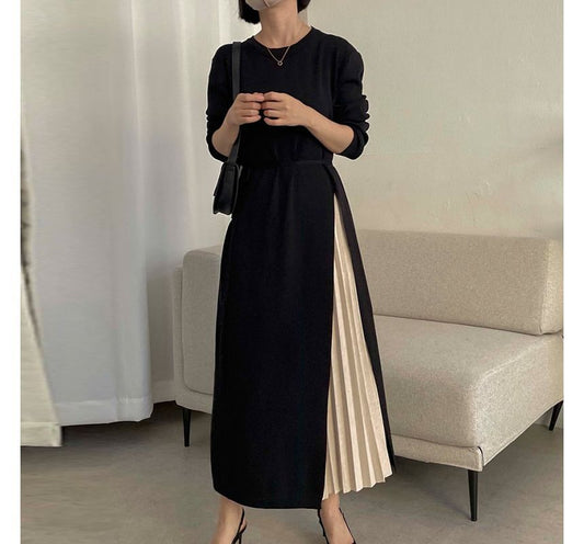 Mock Two-Piece Long-Sleeve Pleated Panel Midi A-Line Knit Dress
