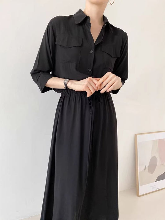 Long Sleeve Collared Plain Double Breasted Midi A-Line Shirt Dress