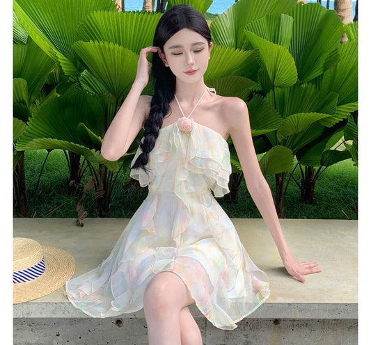 Halter-Neck Floral Print Ruffled Mini A-Line Dress