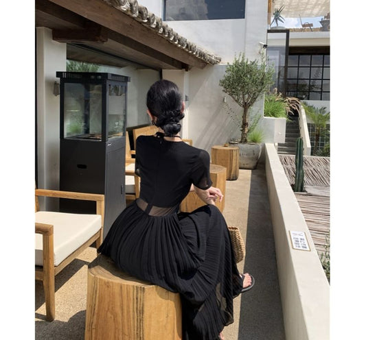 Mock Two-Piece Spaghetti Strap Plain Shirred Accordion Pleat Midi Sundress