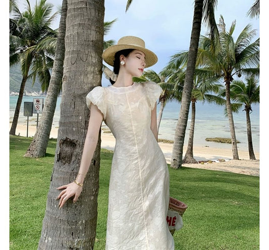 Puff-Sleeve Plain Drawstring Floral Print Open Back Midi Sundress