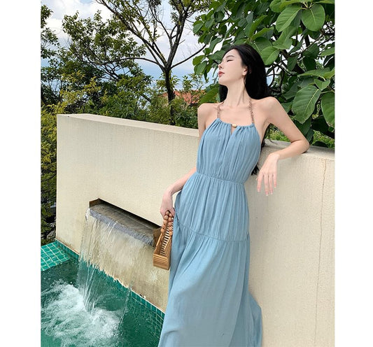 Set: Halter-Neck Plain Keyhole Midi Sundress + Chain Belt