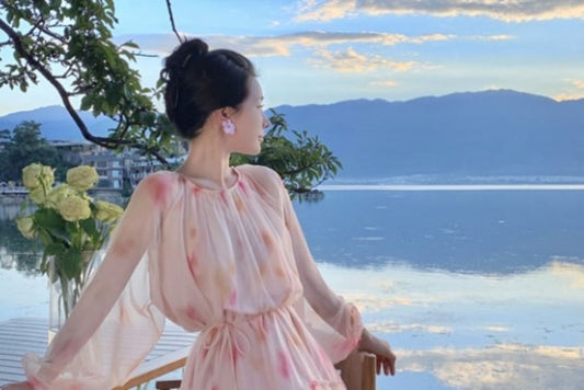 Puff-Sleeve Tie-Dyed Midi A-Line Dress