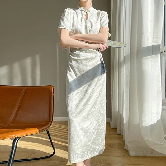 Short-Sleeve Lace Trim Floral Print Maxi Qipao Dress