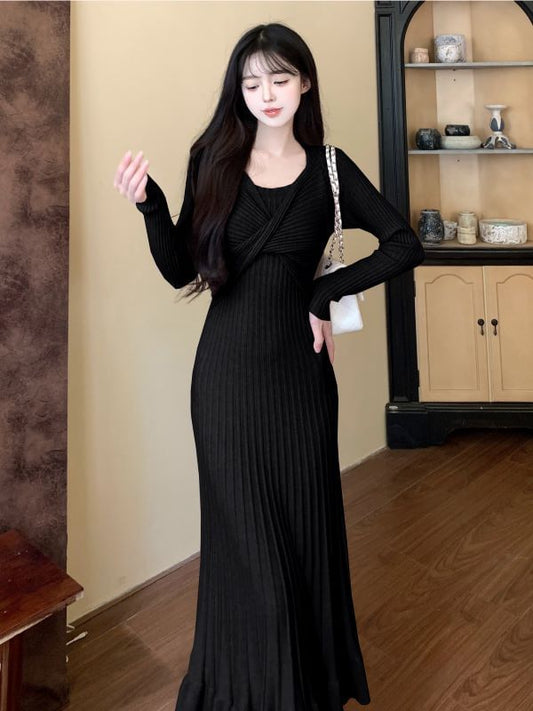Long Sleeve Round Neck Plain Ruffle Mock Two Piece Twist Knit Midi A-Line Dress