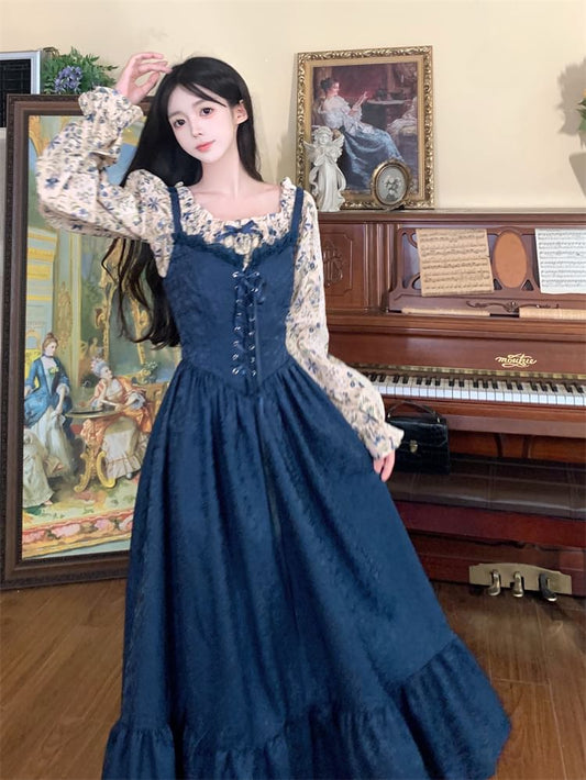 Long-Sleeve Square Neck Floral Blouse / Spaghetti Strap Lace Up Midi A-Line Dress
