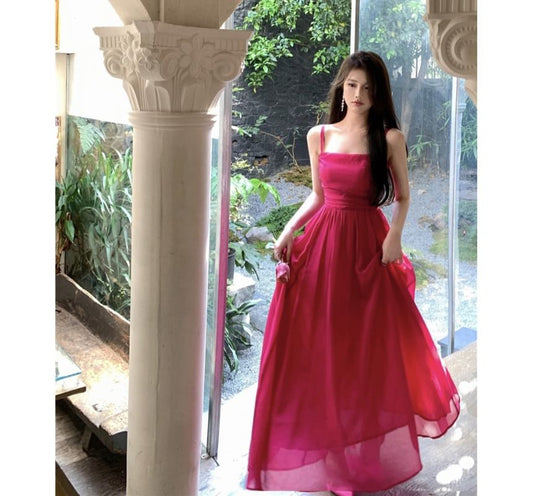 Spaghetti Strap Plain Shirred Midi A-Line Dress