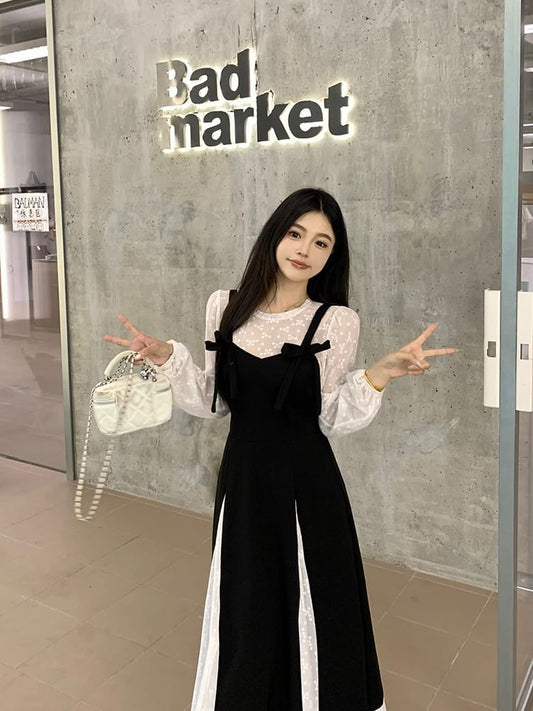 Long Sleeve V-Neck Bowknot Mock Two Piece Midi A-Line Dress