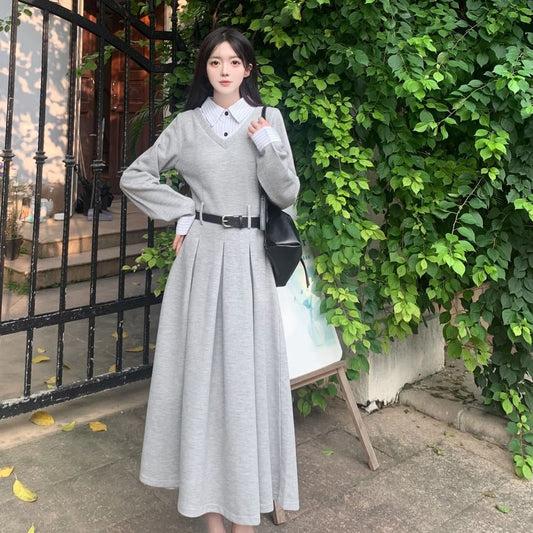 Long Sleeve Collared Dotted Mock Two Piece A-Line Dress (Various Designs)