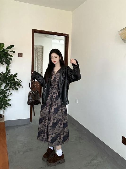 Spaghetti Strap Floral Midi A-Line Dress / Plain Shrug
