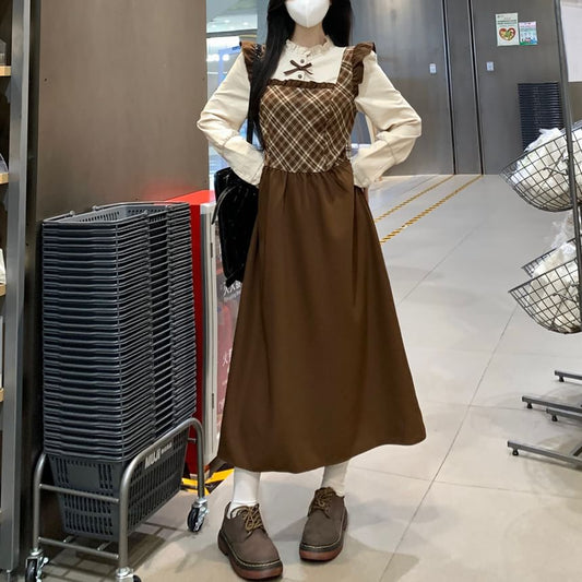Long-Sleeve Mock Neck Knit Top / Plaid Midi Dungaree Dress / Set