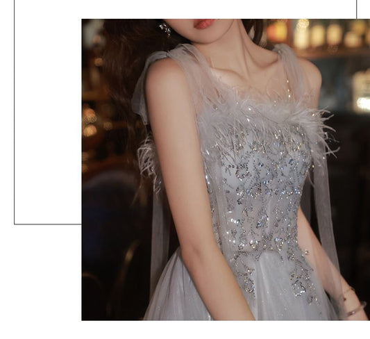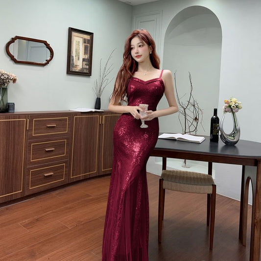 Spaghetti Strap Plain Sequin Trumpet Evening Dress