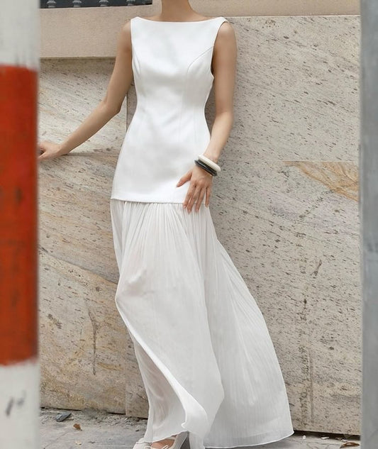 Sleeveless Boat Neck Plain Satin Panel Open Back Maxi A-Line Wedding Dress