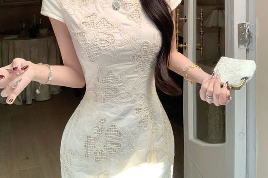Short-Sleeve Stand Collar Lace Midi Sheath Qipao Dress