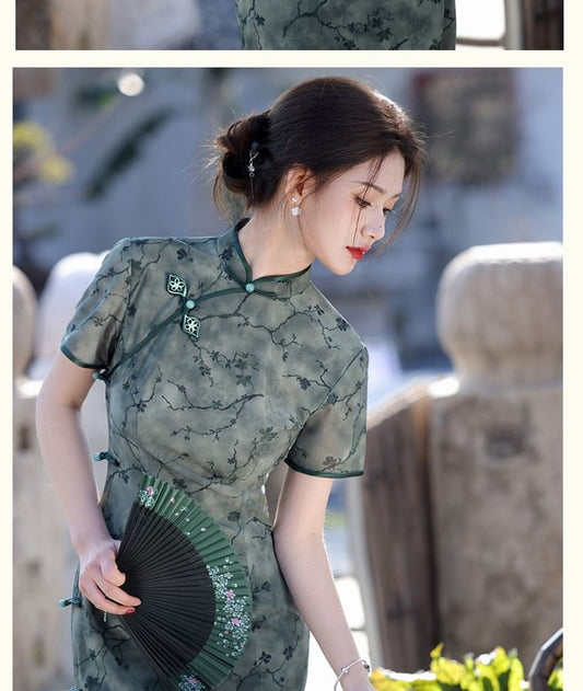 Short-Sleeve Stand Collar Print Mesh Maxi Qipao Dress