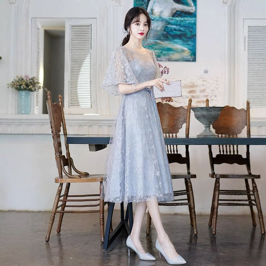 Short-Sleeve Round Neck Mesh Overlay Bow Midi A-Line Evening Dress