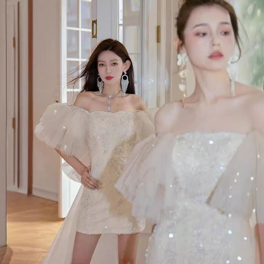 Off Shoulder Plain Midi A-Line Wedding Dress