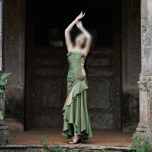 Spaghetti Strap Sweetheart Neck Ruffle Trim Mermaid Evening Dress