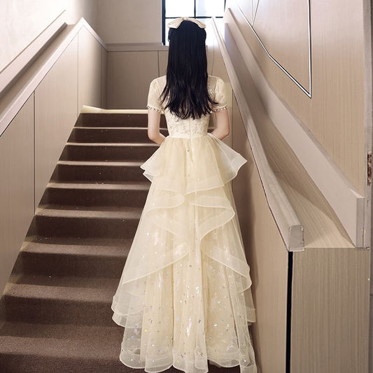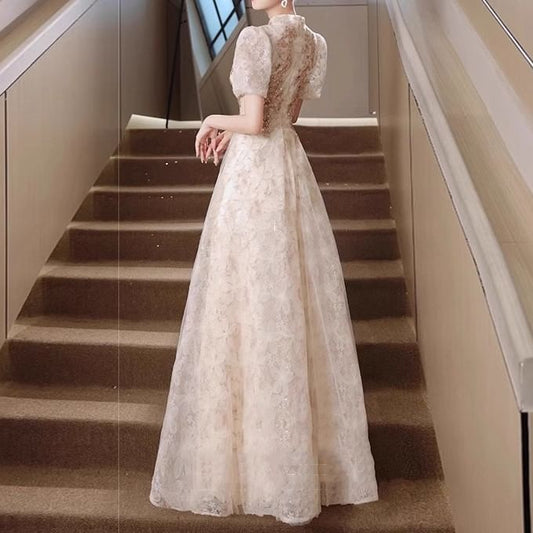 Short-Sleeve Mock Neck Sequin Mesh Overlay Maxi A-Line Evening Dress