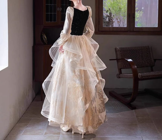 Long-Sleeve Lace Panel A-Line Evening Dress