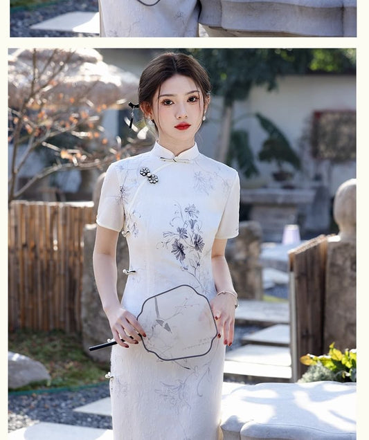 Short-Sleeve Stand Collar Floral Print Midi Qipao Dress