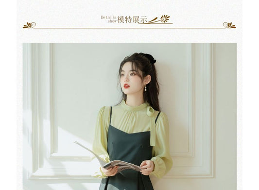 Set: Mock Neck Plain Bow Blouse + Midi Dungaree Dress