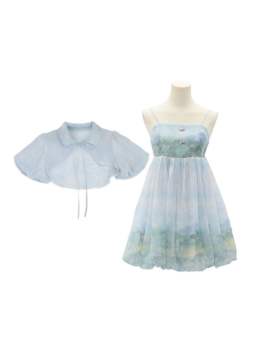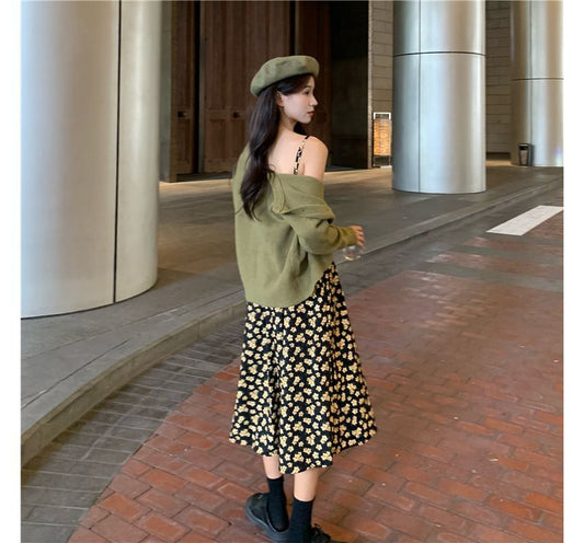 Spaghetti Strap Floral Print Midi A-Line Dress / V-Neck Plain Cardigan kk23