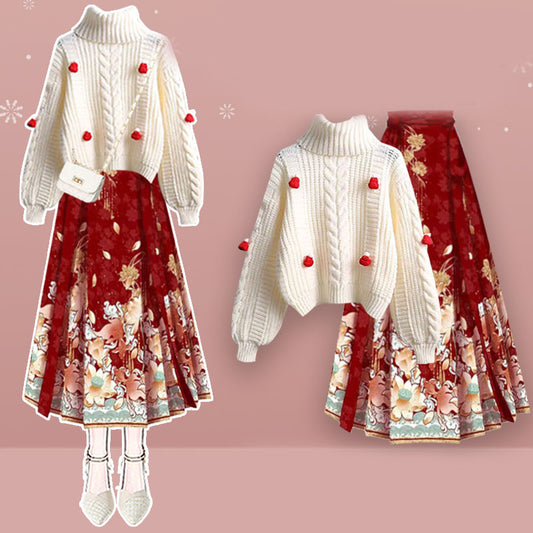 Turtleneck Knit Sweater Vintage Print Lace Up Pleated Skirt