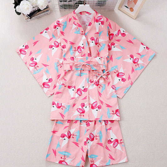Cotton Flamingo Print Kimono Pajamas Set