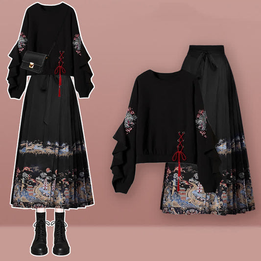 Exquisite Embroideried Lace Up Sweatshirt Pleated Skirt
