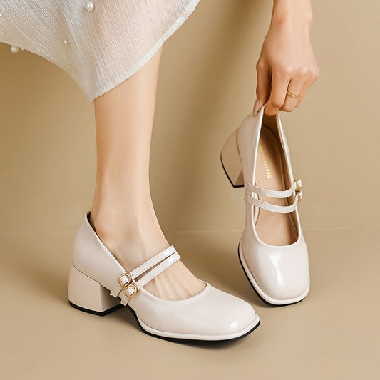 Chunky Heel Plain Buckled Faux Leather Mary Jane Pumps