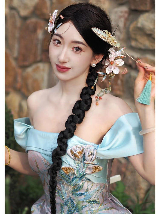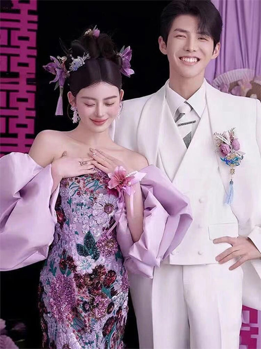 Flower Gown Puff-Sleeve Evening Sequin Embroidered A-Line