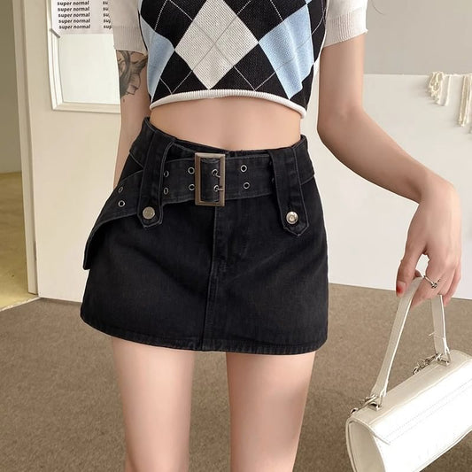 Set: High Waist Plain Mini A-Line Skirt + Belt