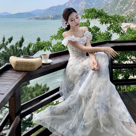 Puff-Sleeve Off-Shoulder Floral Print Ruffle Trim Slit Maxi A-Line Dress