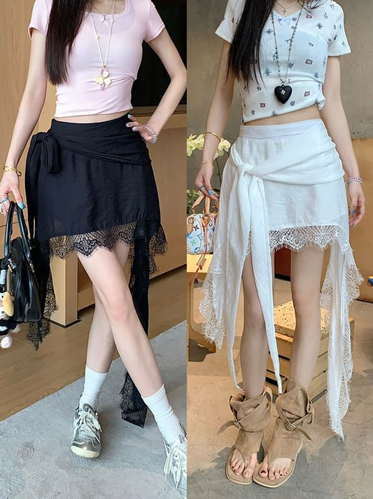 High Waist Plain Lace Trim Asymmetrical Wrap Skort