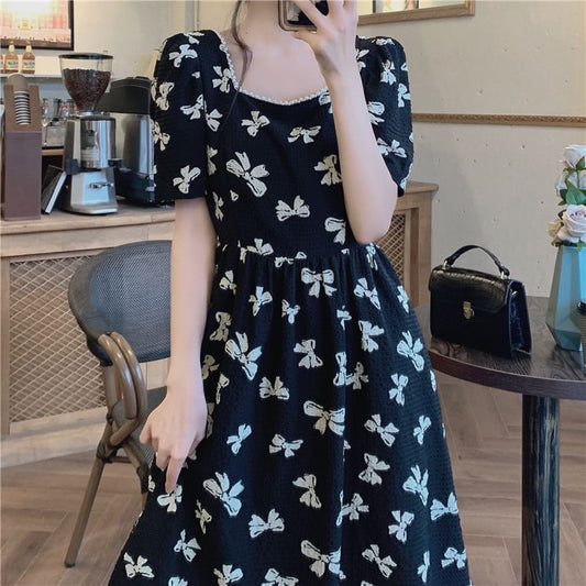 Short-Sleeve Square Neck Bow Print Panel Tie Back Midi A-Line Dress