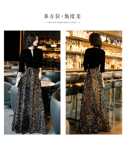 V-Neck Evening Long Mermaid Gown Sleeve Sequin Velvet
