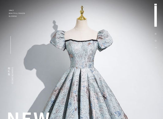 Evening Pleated A-Line Sleeve Puff Jacquard Square Neck Gown