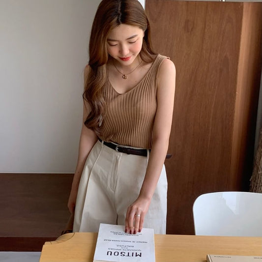 Sleeveless V-Neck Plain Knit Top