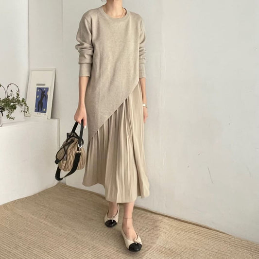 Set: Long-Sleeve Asymmetrical Plain Knit Top + Sleeveless Pleated Midi A-Line Dress