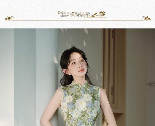 Sleeveless Stand Collar Floral Lace Maxi Sheath Qipao / Plain Crop Cardigan / Set