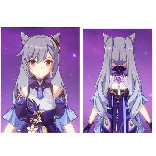 KEQING Gradient Purple Cosplay Long Curly Ponytails Ears Wig MK15298