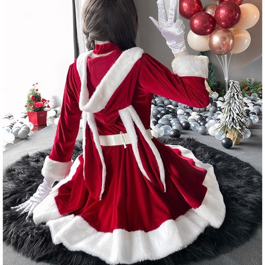 Bunny Ears Bow Knot Hooded Dress Set Christmas