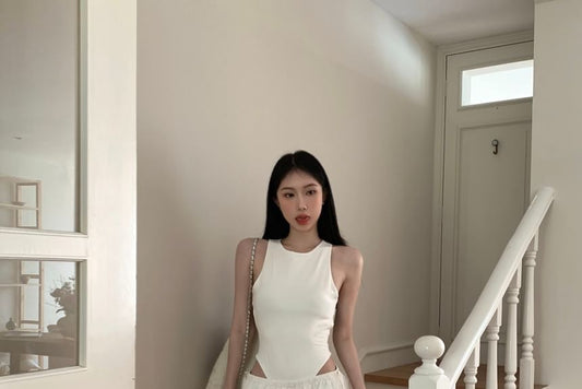 Sleeveless Round Neck Plain Bodysuit Top / Low Waist Plain Ruched Wide Leg Pants