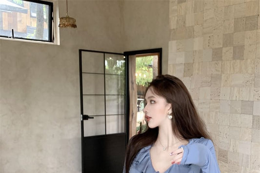 Long Sleeve Scoop Neck Plain Lettuce Edge Button Crop Top