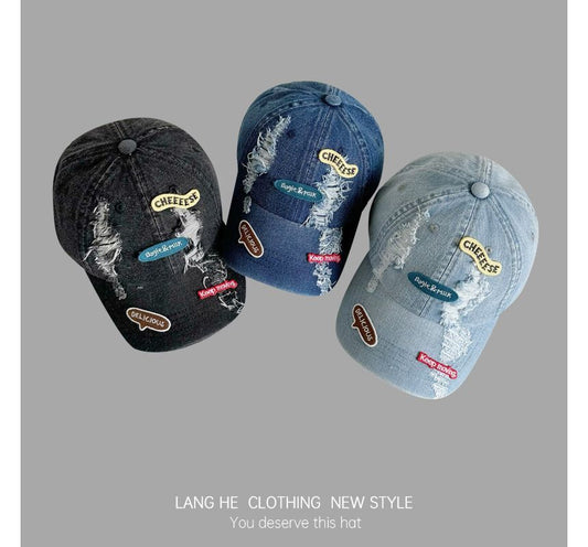Lettering Applique Distressed Denim Baseball Cap